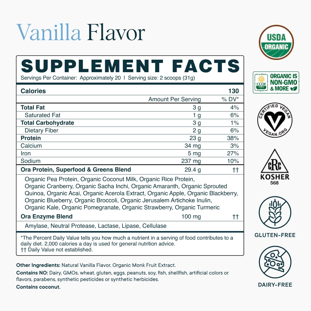 Ora Organic Plant-Based Protein Powder - 23g Protein for Women and Men - Vanilla Flavor 20 Servings, Vegan, Clean Protein, Third-Party Tested, Gluten-Free - 20 Servings