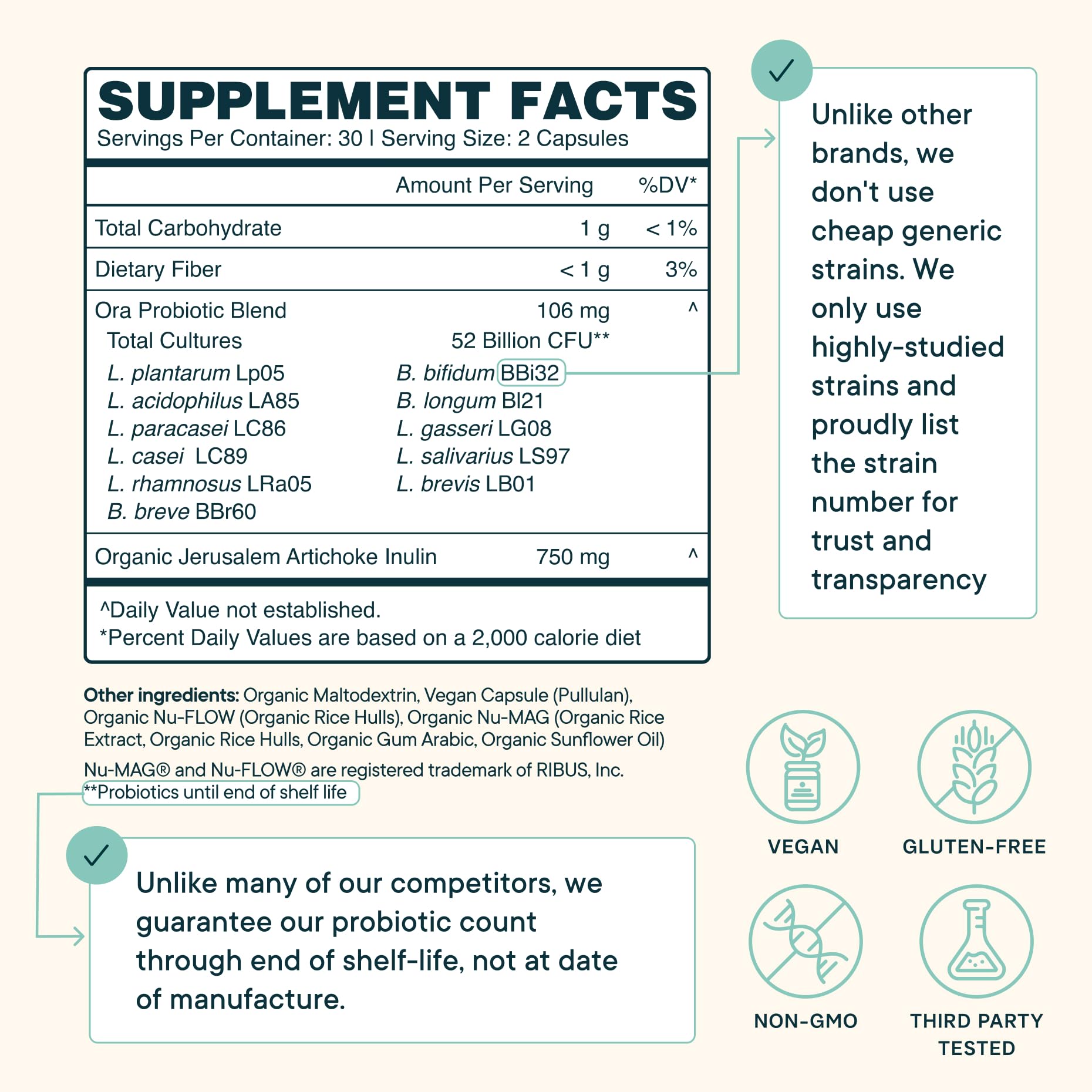 Ora Organic Probiotics and Prebiotics for Digestive Wellness - 16 Billion CFU, 6 Clinically Studied Strains, Vegan, Dairy & Gluten Free | Nourish Your Gut Health, 60 Capsules